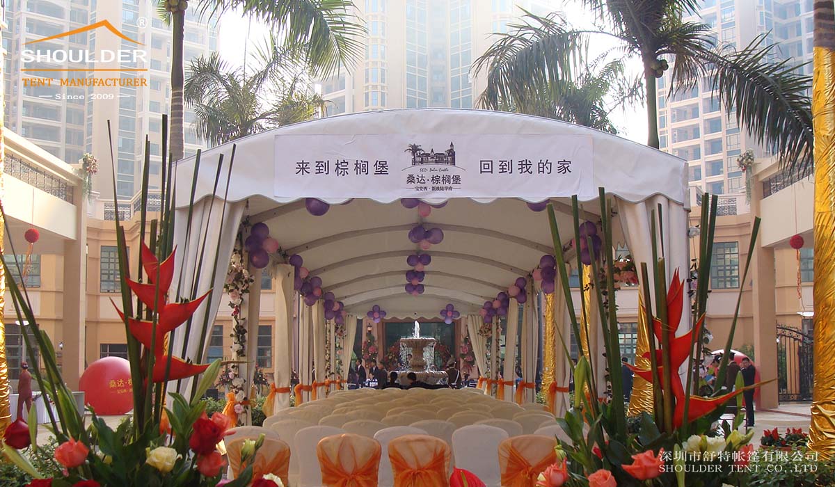 shoulder The tent manufacturer designed a small conference tent, which is custom-made for receiving customers, with a capacity of about 70 people, and it is equipped with tables and stools.