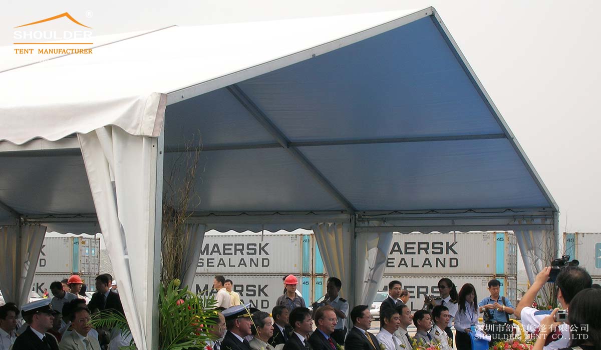 People always worry about the weather when holding activities in the port.With Shoulder tent,you don’t have to worry.It can protect customers from wind and rain.At the same time,it can accomodate enough people to participate in activities. Shoulder can provide custom event marquee. It’s fast to install and disassembly. The interior space can also be customized according to the design concept of the costumer, including the floor installation, the stage construction, the space decoration, lighting, and other sound effects.