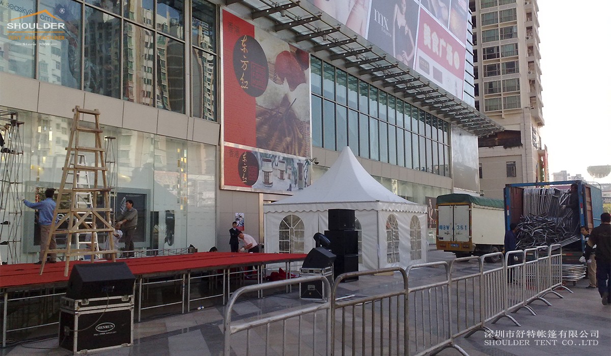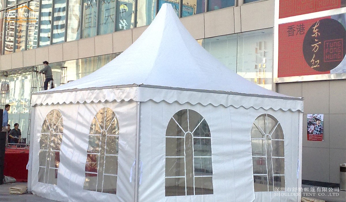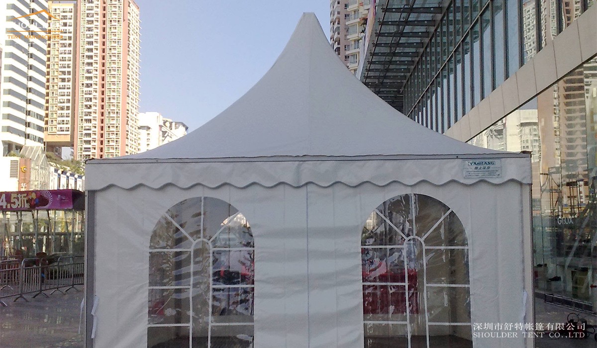 Shoulder Tents provides 8 pagoda tents, the size is 10x10m. Our pagoda tents are widely used in weddings, parties, events, exhibitions and more. A full line of accessories is available, such as glass door systems, glass wall systems and floor systems, etc. It is widely used in different occasions, including weddings, parties, banquet events, etc.