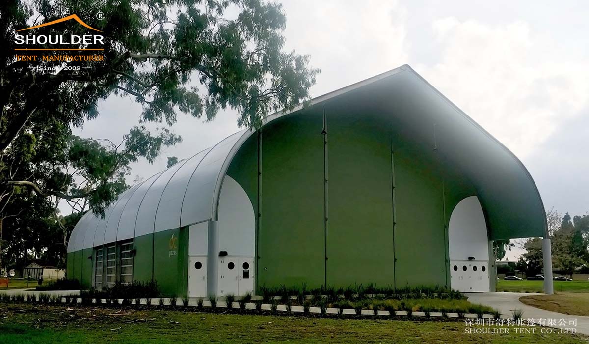 Shoulder tents are made of aluminum frames, which are easy to assemble and disassemble. Therefore, peach-shaped tents can be used in different applications: event tents, sports tents, storage tents, large-scale exhibition hall tents, etc. The most popular tent construction is sports tents, such as: football tents, tennis tents, ice skating sports, swimming sports, etc.